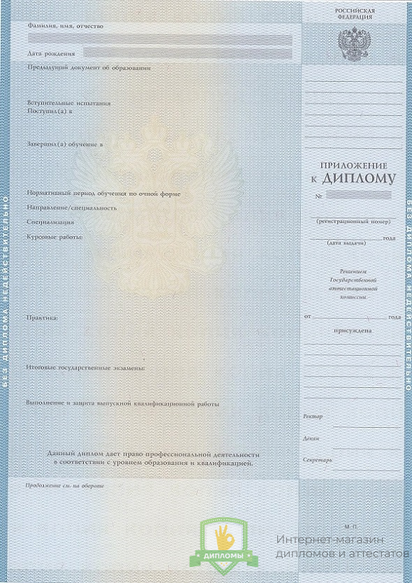 Прибрести диплом специалиста 2010 - 2011 год вы можете в компании «ОК-Дипломы». Работаем на профильном рынке более 20 лет, предлагая клиентам высококачественный сервис и разумные цены. У нас диплом специалиста 2010 - 2011 год выполняется на оригинальном бланке Гознак, дополняется подлинными подписями и печатями.